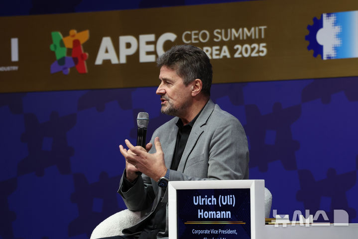 [경주=뉴시스] 추상철 기자 = 울리 호만(Ulrich Homann) 마이크로소프트 부사장이 31일 경북 경주예술의전당에서 열린 아시아태평양경제협력체(APEC) CEO 서밋에서 '에이전틱 AI를 통한 더 스마트한 에너지: 데이터센터 전력 관리의 재정의'를 주제로 발언하고 있다. (공동취재) 2025.10.31. [email protected]