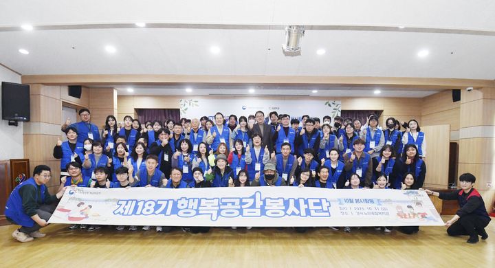 [서울=뉴시스] 임기근 기획재정부 차관과 행복공감봉사단장 배우 박하선이 31일 서울 강서구 강서노인종합복지관에서 열린 '제18기 행복공감봉사단 5차 봉사활동'에 참석해 봉사단원들과 기념촬영을 하고 있다. (사진=기획재정부 제공) 2025.10.31. [email protected] *재판매 및 DB 금지
