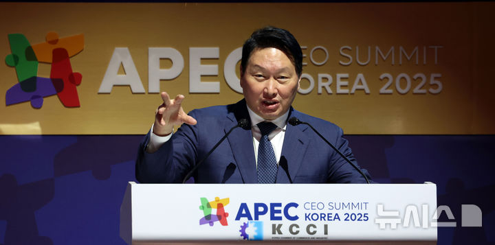 [경주=뉴시스] 추상철 기자 = 최태원 대한상공회의소 회장이 31일 경북 경주예술의전당에서 열린 아시아태평양경제협의체(APEC) CEO 서밋 폐회식 및 인계식(Handover Ceremony)에서 폐회사를 하고 있다. (공동취재) 2025.10.31. [email protected]