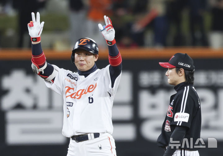 [대전=뉴시스] 김근수 기자 = 31일 대전 중구 한화생명볼파크에서 열린 2025 KBO 한국시리즈 5차전 LG 트윈스와 한화 이글스의 경기, 2회말 1사 주자 1루상황에서 한화 하주석이 안타를 치고 기뻐하고 있다. 2025.10.31. [email protected]