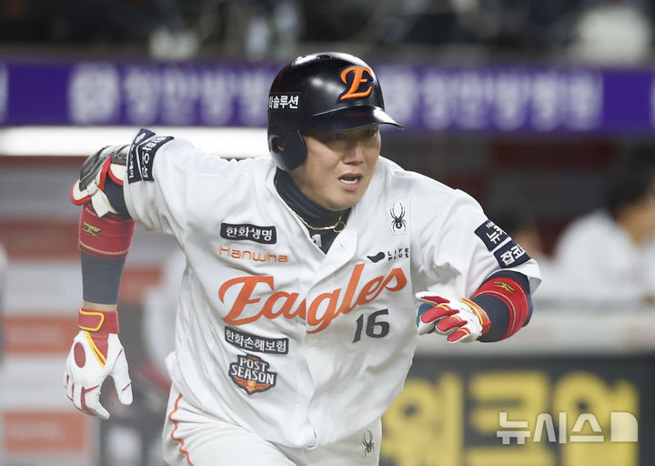[대전=뉴시스] 김근수 기자 = 31일 대전 중구 한화생명볼파크에서 열린 2025 KBO 한국시리즈 5차전 LG 트윈스와 한화 이글스의 경기, 2회말 1사 주자 1루상황에서 한화 하주석이 안타를 치고 있다. 2025.10.31. [email protected]