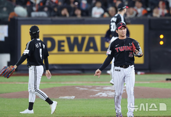 [대전=뉴시스] 조성우 기자 = 31일 대전 중구 한화생명볼파크에서 열린 2025 KBO 한국시리즈 5차전 LG 트윈스와 한화 이글스의 경기, LG 2루수 신민재와 유격수 오지환(오른쪽)이 한화 3회말 공격 무사 주자 1, 2루서 문현빈의 타구를 병살처리한 뒤 몸을 풀고 있다. 2025.10.31. [email protected]