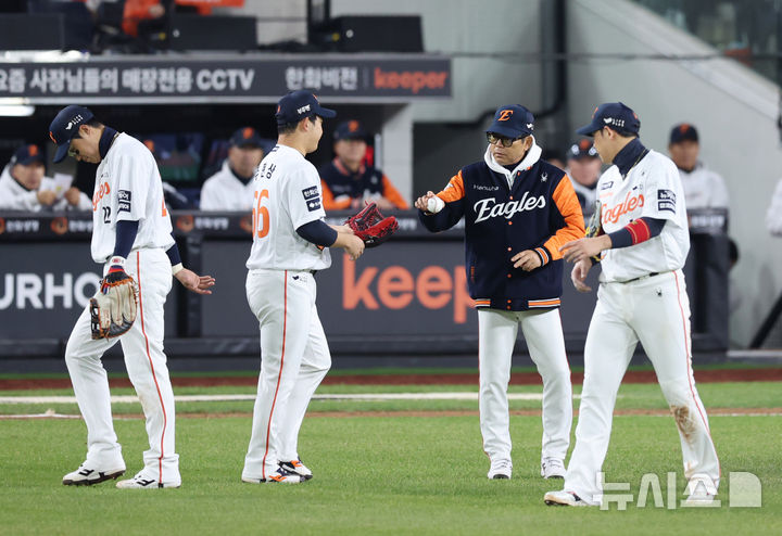 [대전=뉴시스] 조성우 기자 = 31일 대전 중구 한화생명볼파크에서 열린 2025 KBO 한국시리즈 5차전 LG 트윈스와 한화 이글스의 경기, 한화 양상문 투수코치가 조동욱에서 주현상으로 투수 교체하고 있다. 2025.10.31. [email protected]