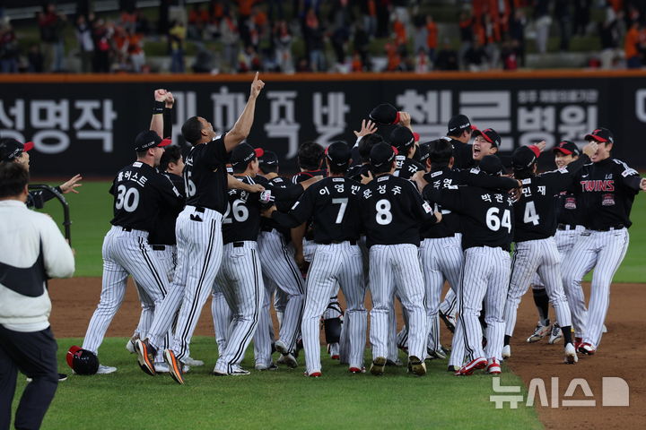 [대전=뉴시스] 조성우 기자 = 31일 대전 중구 한화생명볼파크에서 열린 2025 KBO 한국시리즈 5차전 LG 트윈스와 한화 이글스의 경기,  LG트윈스가 4-1로 승리하며 우승을 확정 지은 LG 선수들이 기뻐하고 있다. 2025.10.31. [email protected]