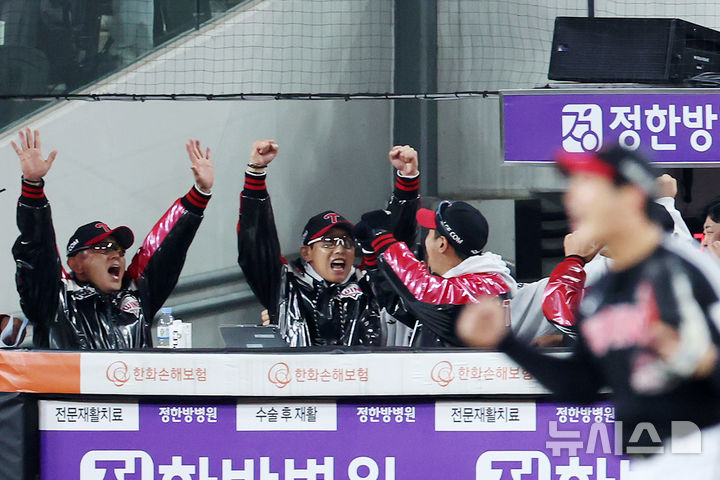 [대전=뉴시스] 조성우 기자 = 31일 대전 중구 한화생명볼파크에서 열린 2025 KBO 한국시리즈 5차전 LG 트윈스와 한화 이글스의 경기에서 4-1로 승리하며 우승을 확정 지은 LG 염경염 감독 등 코칭스태프가 기뻐하고 있다. 2025.10.31. [email protected]