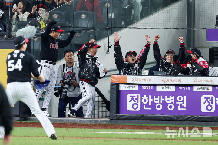 [대전=뉴시스] 조성우 기자 = 31일 대전 중구 한화생명볼파크에서 열린 2025 KBO 한국시리즈 5차전 LG 트윈스와 한화 이글스의 경기에서 4-1로 승리하며 우승을 확정 지은 LG 염경염 감독 등 코칭스태프가 기뻐하고 있다. 2025.10.31. [email protected]