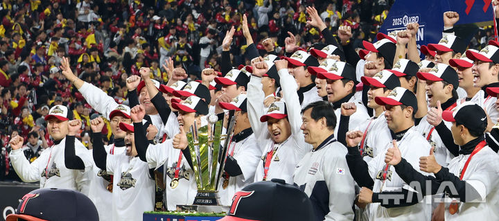 [대전=뉴시스] 강종민 기자 = 31일 대전 중구 한화생명볼파크에서 2025 KBO 한국시리즈 우승을 차지한 LG 트윈스 염경엽 감독과 선수들이 우승 트로피를 앞에 두고 파이팅을 외치고 있다. 2025.10.31. [email protected]