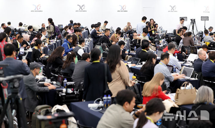 [경주=뉴시스] 이무열 기자 = APEC(아시아태평양경제협력체) 정상회의 폐막일인 1일 경북 경주화백컨벤션센터(HICO) 내 마련된 국제미디어센터(IMC)가 각국에서 온 취재진으로 붐비고 있다. 2025.11.01. [email protected]