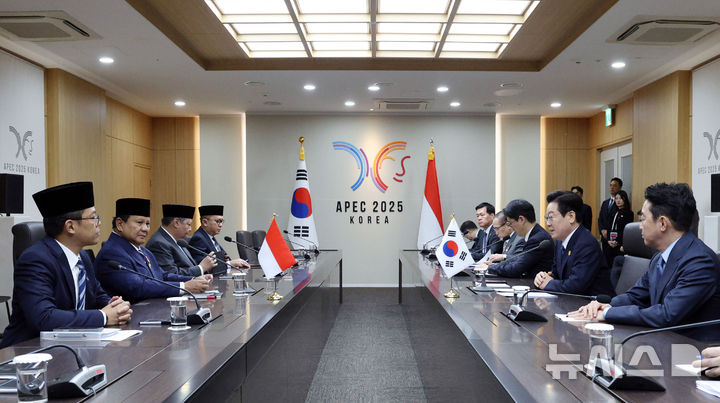 [경주=뉴시스] 고범준 기자 = 이재명 대통령과 프라보워 수비안토 인도네시아 대통령이 1일 경북 경주화백컨벤션센터 APEC 정상회의장에서 한-인도네시아 정상회담을 하고 있다. 2025.11.01. [email protected]