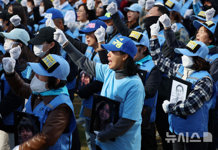 [서울=뉴시스] 조성우 기자 = 12·29 여객기 참사 유가족들이 1일 오후 서울 용산구 용산역 앞에서 영정을 들고 여객기 추락 참사에 대한 진상규명과 책임자 처벌을 촉구하는 행진에 앞서 구호를 외치고 있다. 2025.11.01. [email protected]