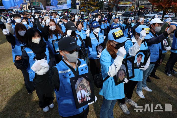 [서울=뉴시스] 조성우 기자 = 12·29 여객기 참사 유가족들이 1일 오후 서울 용산구 용산역 앞에서 영정을 들고 여객기 추락 참사에 대한 진상규명과 책임자 처벌을 촉구하는 행진에 앞서 구호를 외치고 있다. 2025.11.01. [email protected]