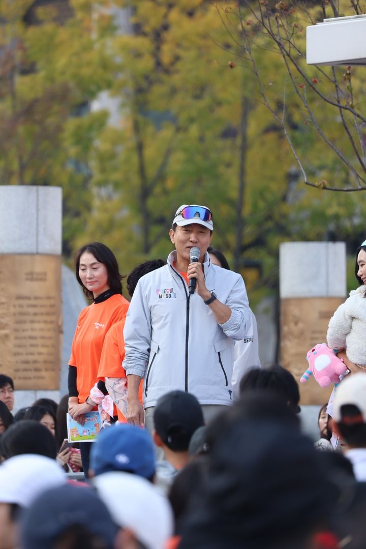 [서울=뉴시스] 오세훈 서울시장이 1일 오전 서울 종로구 광화문광장에서 열린 '2025 서울 유아차 런'에서 인사말 하고 있다. (사진=서울시 제공) 2025.11.01. [email protected]