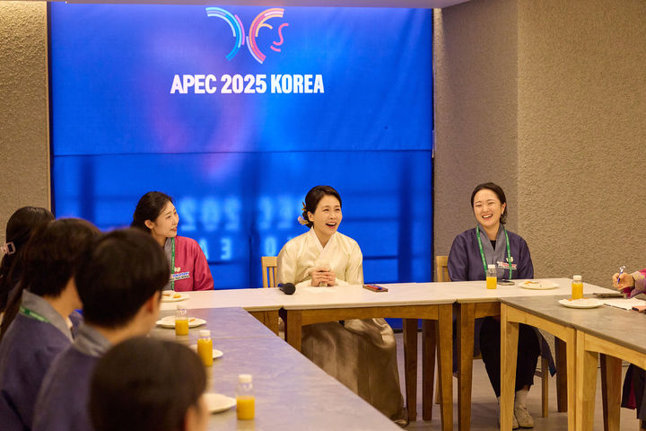 [경주=뉴시스] 최동준 기자 = 김혜경 여사가 1일 경북 경주시 APEC(아시아태평양경제협력체) 정상회의 자원봉사자 숙소를 방문해 봉사자들을 격려하고 있다. (사진=대통령실 제공) 2025.11.01. [email protected]