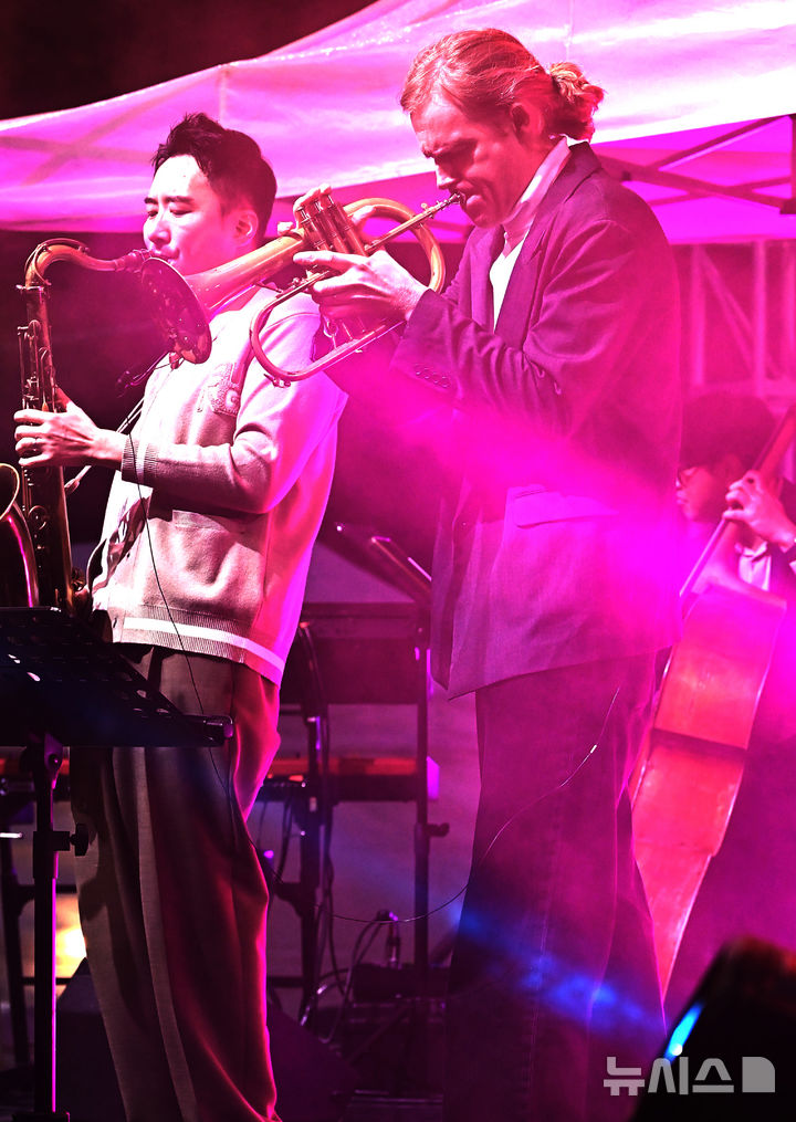 [화성=뉴시스] 김종택 기자 = '2025 화성재즈페스티벌'이 열린 1일 오후 경기 화성시 향남 도원체육공원에 마련된 무대에서 윱 반 라인 라임이 열띤 공연을 펼치고 있다. 2025.11.01. [email protected]