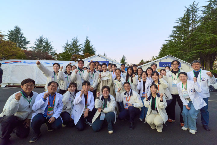 [경주=뉴시스] 최동준 기자 = 김혜경 여사가 1일 경북 경주시 APEC(아시아태평양경제협력체) 정상회의 현장진료소를 방문해 의료지원팀을 격려한 뒤 기념촬영을 하고 있다. (사진=대통령실 제공) 2025.11.01. [email protected]