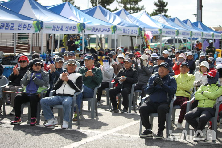 [태안=뉴시스] 최영민 기자=2일 충남 태안군 태안읍 태안군파크골프장에서 열린 2026 태안국제원예 치유박람회 개최기념 전국파크골프대회 참가 선수단이 개회식에 참석했다. 2025.11.02 [email protected]