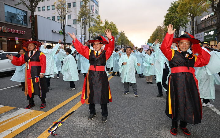 [고창=뉴시스] 1일 개막 4일째 고창군 고창읍성 일원에서 펼쳐지고 있는 '제52회 모양성제', 축제의 하이라이트인 거리퍼레이드가 펼쳐지고 있다. 행렬의 선두에 선 심덕섭 군수와 조민규 군의장 등이 퍼레이드 중간 공연장에서 흥겨운 춤을 추고 있다. (사진=고창군 제공) 2025.11.02. [email protected]