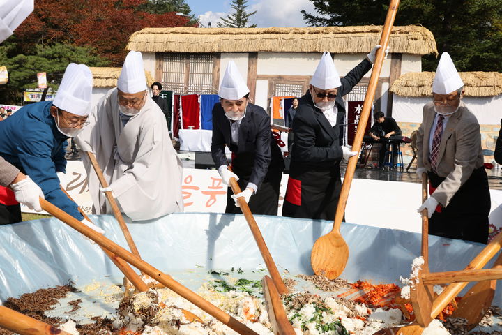 [보은=뉴시스] 2일 충북 보은 속리산 잔디공원에서 열린 ‘2025 속리산 가을풍류 축제’에서 최재형 보은군수 등 기관·단체장과 상인들이 100인분 대형 비빔밥 만들기 퍼포먼스를 진행하고 있다. (사진=보은군 제공) 2025.11.02. [email protected]