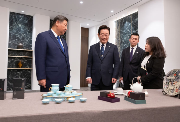 [서울=뉴시스] 이재명 대통령과 시진핑 중국 국가주석이 1일 경북 소노캄 경주 그랜드볼룸에서 정상회담에 앞서 이 대통령은 시 주석에게 최고급 바둑판 세트와 나전칠기 쟁반을, 시 주석은 이 대통령에게 샤오미 스마트폰과 문방사우 세트를 선물했다. (사진=대통령실 제공) 2025.11.02. [email protected] *재판매 및 DB 금지