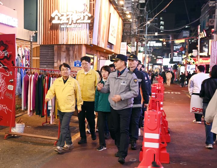 [서울=뉴시스] 고승민 기자 = 김광용 행정안전부 재난안전관리본부장이 지난 1일 인파 밀집 관리 대상 지역인 서울 마포구 홍대 관광특구 거리를 점검하고 있다. (사진=행정안전부 제공) 2025.11.02. [email protected] *재판매 및 DB 금지