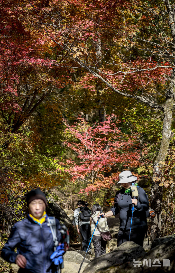 [서울=뉴시스] 정병혁 기자 = 완연한 가을 날씨를 보인 2일 서울 강북구 북한산국립공원 백운대 코스를 찾은 등산객들이 물든 단풍 아래를 걸으며 산을 오르고 있다. 2025.11.02. [email protected]