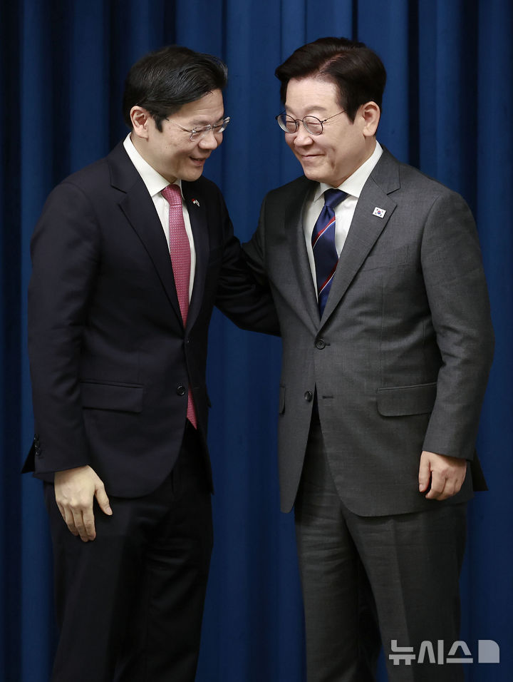 [서울=뉴시스] 최동준 기자 = 이재명 대통령과 로렌스 웡 싱가포르 총리가 2일 서울 용산 대통령실 청사에서 공동언론발표를 마친 뒤 인사하고 있다. 2025.11.02. [email protected]