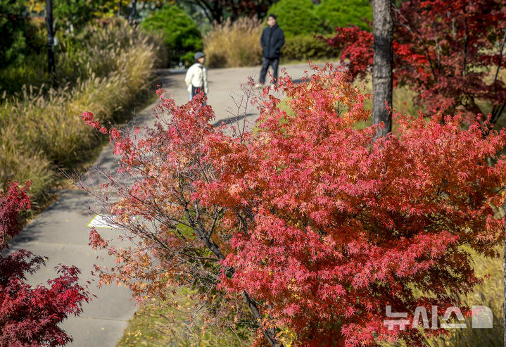 [서울=뉴시스] 정병혁 기자 = 완연한 가을 날씨를 보인 2일 서울 중구 백범광장을 찾은 시민들이 물든 단풍 아래를 걸으며 가을 정취를 느끼고 있다. 2025.11.02. [email protected]