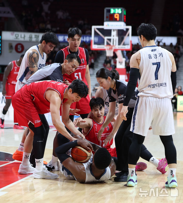 [안양=뉴시스] 김선웅 기자 = 2일 경기 안양시 정관장 아레나에서 열린 2025-2026 프로농구 안양 정관장 vs 고양 소노의 경기, 양팀 선수들이 볼 점유를 다투고 있다. 2025.11.02. [email protected]