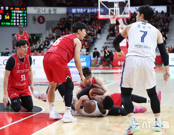 [안양=뉴시스] 김선웅 기자 = 2일 경기 안양시 정관장 아레나에서 열린 2025-2026 프로농구 안양 정관장 vs 고양 소노의 경기, 양팀 선수들이 볼 점유를 다투고 있다. 2025.11.02. [email protected]