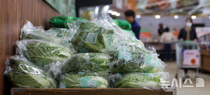 대형마트 기준으로는 47만7750원으로 작년보다 8.4% 감소한 것으로 분석됐다. 2일 서울 시내의 한 유통매장에서 배추·무 등 김장재료가 판매되고 있다. 2025.11.02. [email protected]
