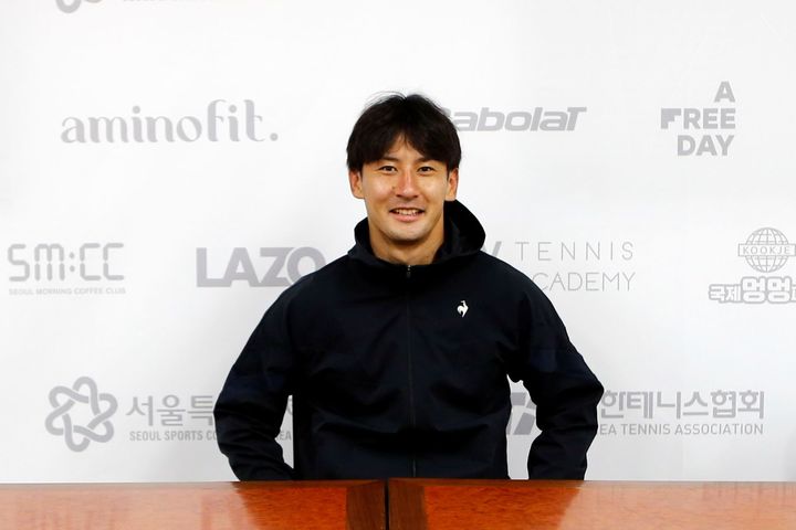 [서울=뉴시스] 조성봉 기자 = 시마부쿠로 쇼가 2일 서울 송파구 올림픽공원 테니스경기장에서 열린 2025유진투자증권 서울오픈 국제 남자 챌린저 테니스대회에서 우승한 뒤 인터뷰를 하고 있다. (사진= 2025 유진투자증권 서울오픈 테니스 조직위 제공)2025.11.02.  [email protected]