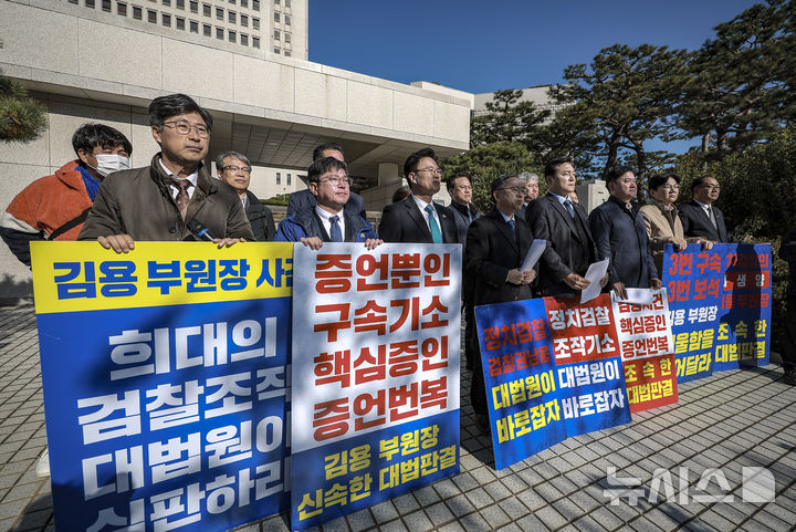 [서울=뉴시스] 정병혁 기자 = 3일 서울 서초구 대법원 앞에서 열린 정치검찰 규탄 및 사법정의 촉구 기자회견에서 정진욱, 조계원, 김문수 국회의원 등 참석자들이 피켓을 들고 있다. 2025.11.03. [email protected]