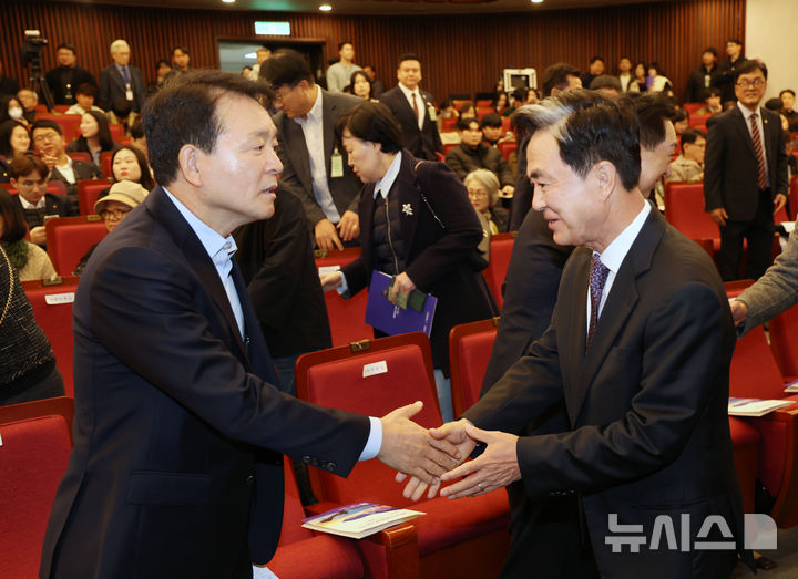 [서울=뉴시스] 김명년 기자 = 성일종 국민의힘 의원이 3일 오전 서울 여의도 국회 도서관 대강당에서 열린 '대전충남 행정통합 국회 포럼'에서 김태흠 충남도지사와 악수하고 있다. 2025.11.03. [email protected]