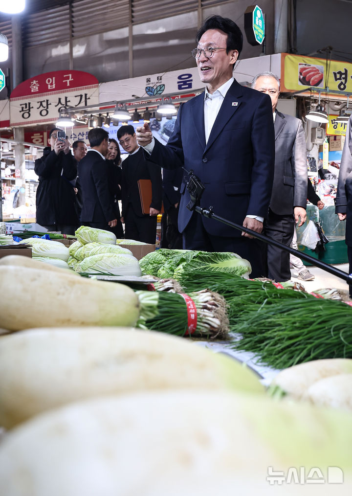 [서울=뉴시스] 박주성 기자 = 김민석 국무총리가 3일 김장 물가 점검차 서울 동대문구 경동시장을 방문해 상인과 이야기를 나누고 있다. (공동취재). 2025.11.03. [email protected]