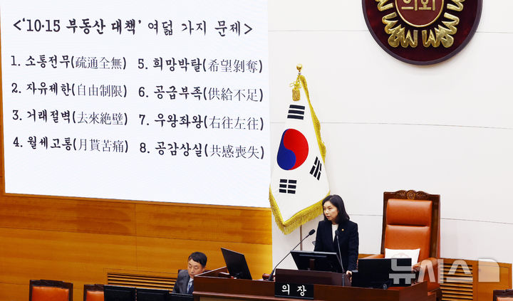 [서울=뉴시스] 박주성 기자 = 최호정 서울시의회 의장이 3일 서울 중구 시의회 본회의장에서 열린 제333회 정례회 1차 본회의 개회사에서 10.15 부동산 대책 문제에 관해서 발언하고 있다. 2025.11.03. [email protected]