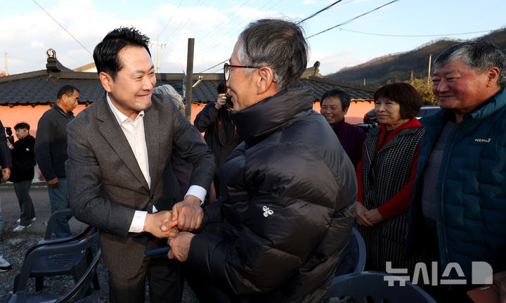 [안동=뉴시스] 이무열 기자 = 장동혁 국민의힘 대표가 3일 산불 피해지역인 경북 안동시 일직면을 찾아 이재민을 위로하고 있다. 2025.11.03. [email protected]