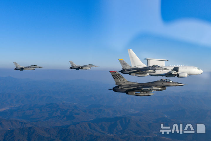 [서울=뉴시스] 연합 편대비행 공중 지휘에 나선 진영승 합참의장과 존 대니얼 케인 미국 합참의장이 탑승한 KF-16, F-16과 E-737 항공통제기 등 항공기가 3일 한반도 상공을 비행하고 있다. (사진=합동참모본부 제공) 2025.11.03. [email protected]