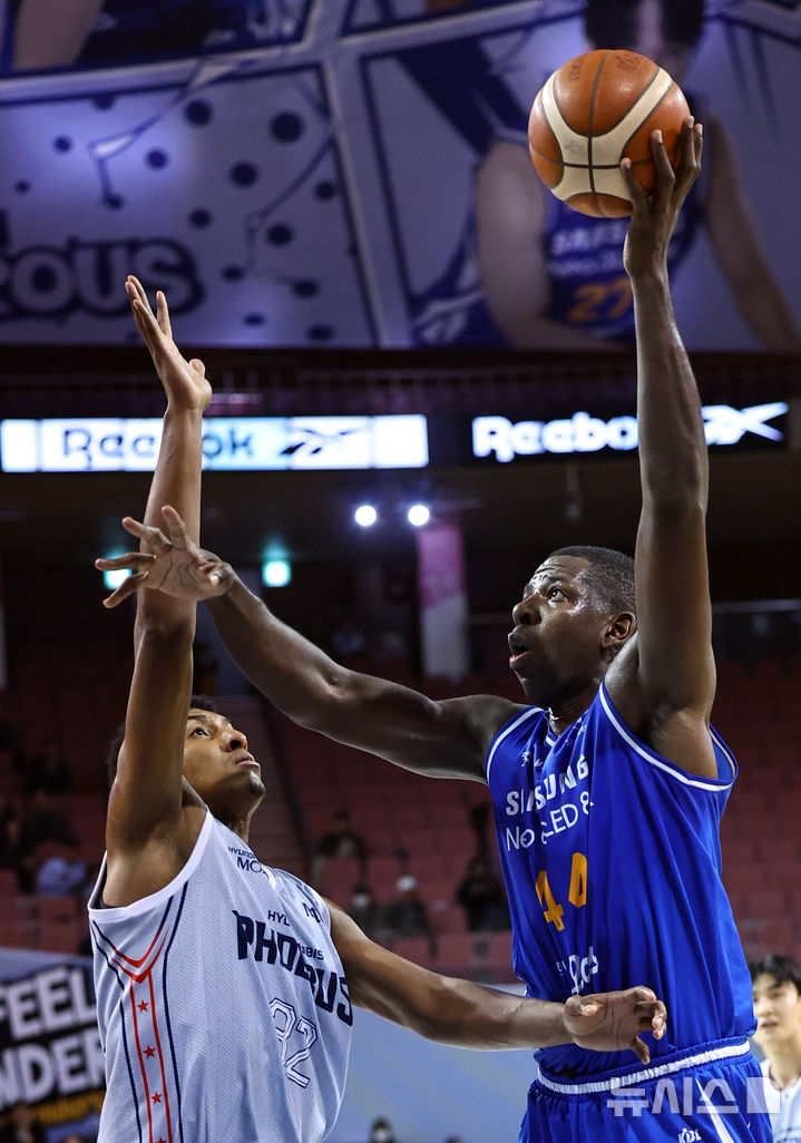 [서울=뉴시스] 최진석 기자 = 3일 서울 송파구 잠실실내체육관에서 열린 2025-2026 KBL 프로농구 울산 현대모비스와 서울 삼성의 경기, 삼성 앤드류 니콜슨이 슛을 쏘고 있다. 2025.11.03. [email protected]