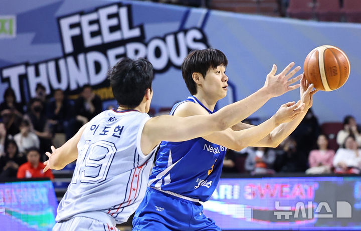 [서울=뉴시스] 최진석 기자 = 3일 서울 송파구 잠실실내체육관에서 열린 2025-2026 KBL 프로농구 울산 현대모비스와 서울 삼성의 경기, 삼성 한호빈이 패스를 하고 있다. 2025.11.03. [email protected]