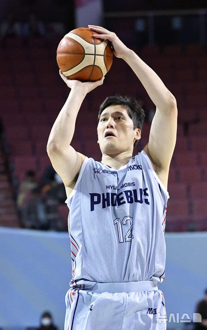 [서울=뉴시스] 최진석 기자 = 3일 서울 송파구 잠실실내체육관에서 열린 2025-2026 KBL 프로농구 울산 현대모비스와 서울 삼성의 경기, 현대모비스 함지훈이 미들슛을 쏘고 있다. 2025.11.03. [email protected]