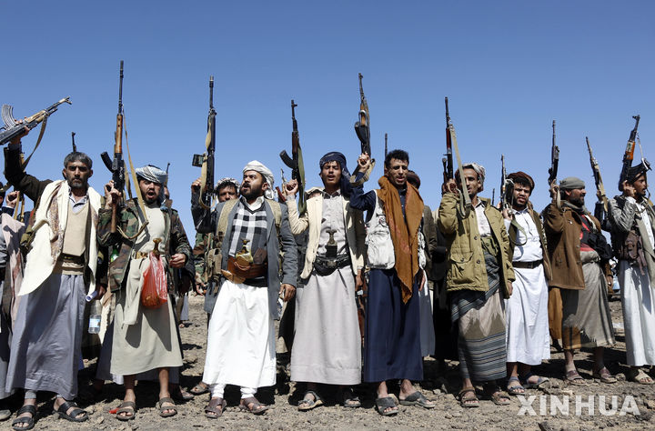 [사나=신화/뉴시스] 예멘 후티 반군 전투원과 지지자들이 3일(현지 시간) 예멘 사나 북부 아라브에서 이스라엘을 규탄하는 무장 집회에 참여하고 있다. 수도 사나와 북서부 대부분을 장악한 후티는 이날 동맹 부족들에게 이스라엘의 공습 가능성에 대비해 총동원을 선언했다. 2025.11.04.