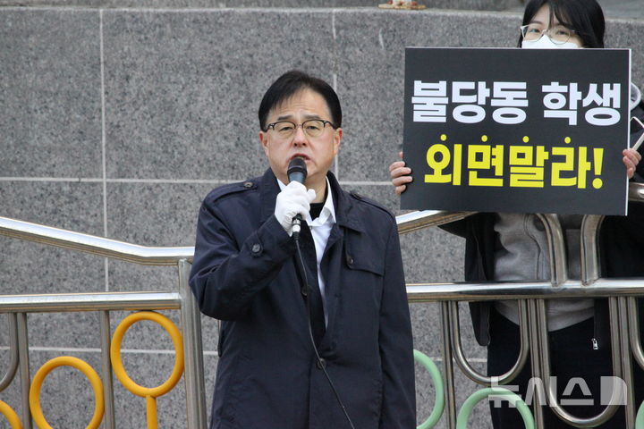 [천안=뉴시스] 최영민 기자=4일 충남 천안시 불당동 천안교육지원청 앞에서 열린 불당동 지역 학부모들의 중학교 배정 관련 집회에서 장혁 천안시의원이 발언하고 있다. 2025.11.04 [email protected]