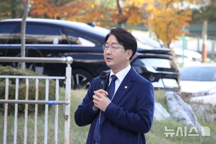 [천안=뉴시스] 최영민 기자=4일 충남 천안시 불당동 천안교육지원청 앞에서 진행된 불당동 학부모들의 중학교 학교 배정 관련 집회에서 구형서 충남도의원이 발언을 하고 있다. 2025.11.04 [email protected]