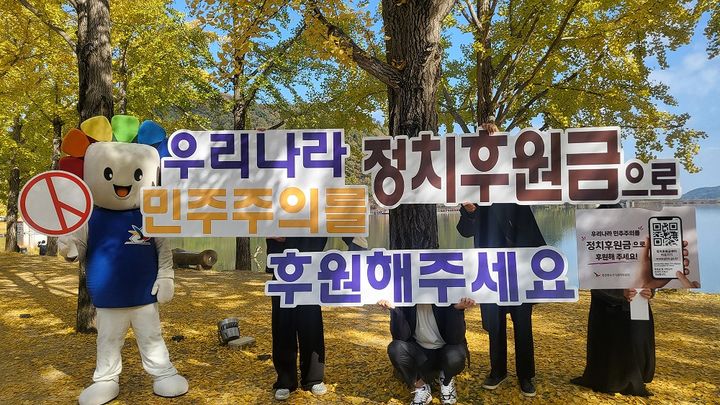 [괴산=뉴시스] 충청북도선거관리위원회 직원들이 4일 괴산군 문광면 소금랜드에서 열린 '괴산 양곡 은행나무 축제' 행사장에서 방문자들을 대상으로 정치후원금 활성화를 위한 홍보 캠페인을 진행하고 있다. (사진=충청북도선거관리위원회 제공) 2025.11.04. [email protected]