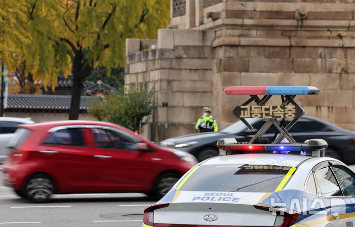 [서울=뉴시스] 배훈식 기자 = 시민이 직접 참여하는 교통문화 개선 프로젝트 '서울교통 Re-디자인 프로젝트'가 시작된 4일 오전 서울 종로구 동십자각 앞 경복궁사거리에서 경찰이 출근길 꼬리물기와 끼어들기 등 교통단속을 하고 있다. 2025.11.04. [email protected]