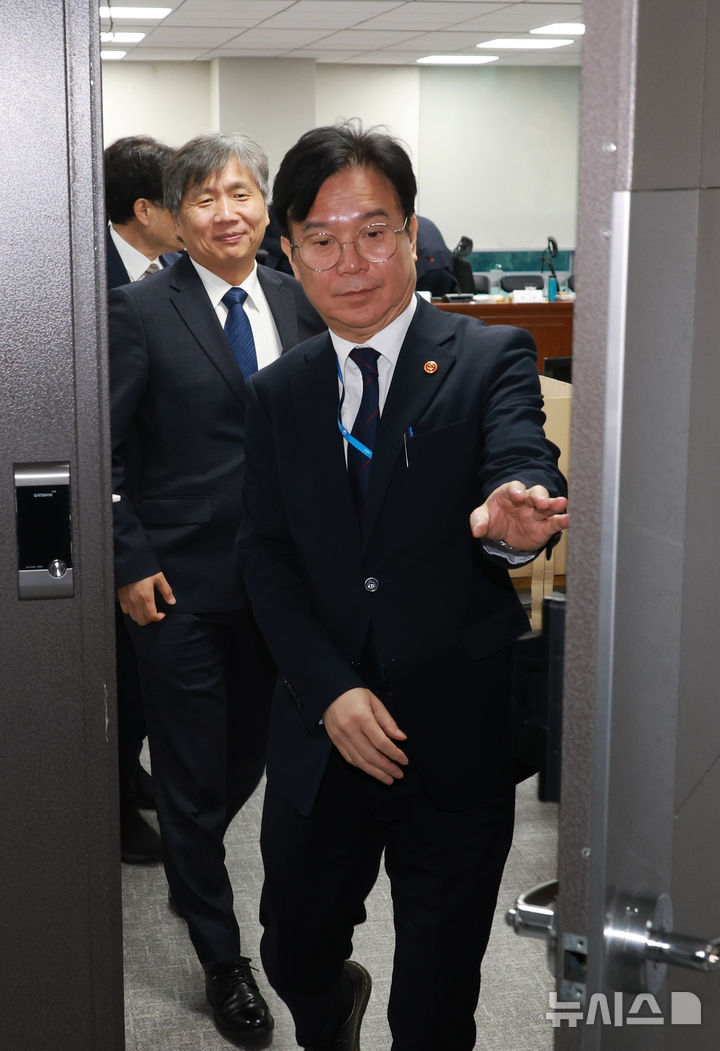 [서울=뉴시스] 고승민 기자 = 김영훈 고용노동부 장관이 4일 서울 여의도 국회 의원회관에서 열린 더불어민주당 기후에너지환경위원과의 당정 협의 후 회의실을 나서고 있다. 2025.11.04. [email protected]