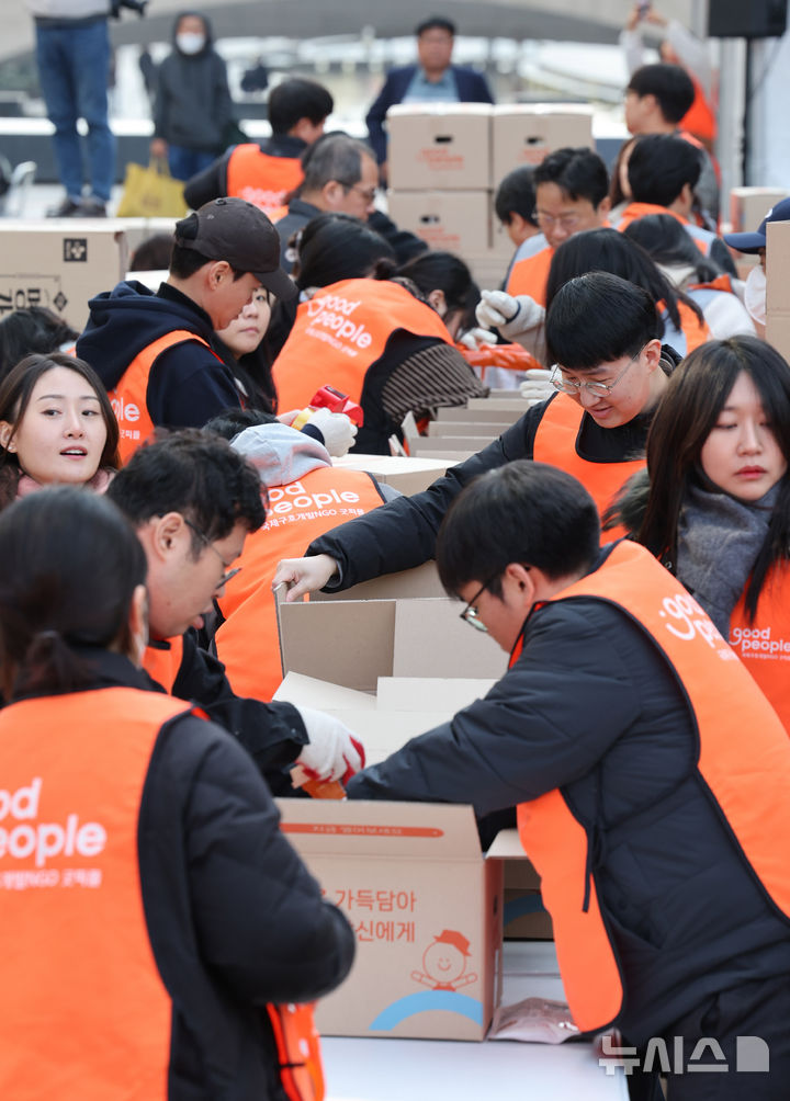[서울=뉴시스] 배훈식 기자 = 2025 굿피플 사랑의 희망박스 박싱데이 행사가 열린 4일 오전 서울 중구 청계광장에서 봉사자들이 희망박스 물품을 담고 있다. 2025.11.04. [email protected]