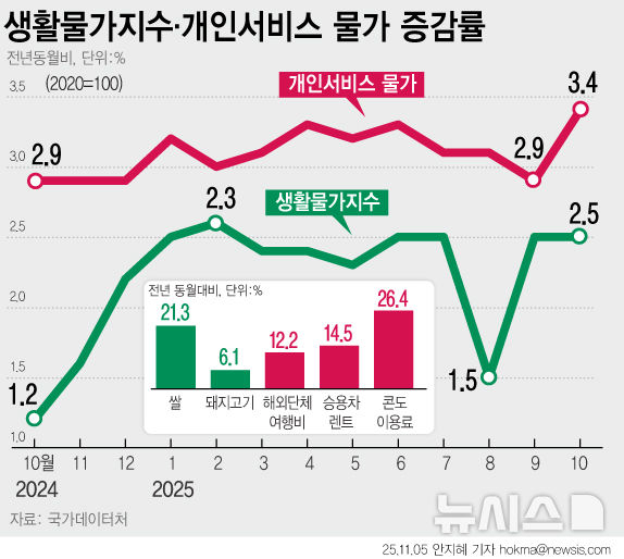 [서울=뉴시스] 5일 국가데이터처에 따르면 지난달 소비자물가가 2.4% 상승했다. 개인서비스는 3.4% 올랐고, 외식 제외 개인서비스는 3.6% 상승해 전체 물가를 0.72%포인트 끌어올렸다. 긴 추석 연휴 영향으로 여행 관련 서비스 등 성수기 품목의 오름세가 두드러진 영향이다. (그래픽=안지혜 기자)