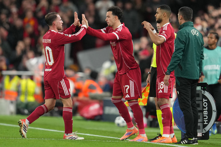 [런던=AP/뉴시스] 리버풀(영국)의 알렉시스 맥알리스터(왼쪽)가 4일(현지 시간) 영국 리버풀의 안필드에서 열린 2025-26 유럽축구연맹(UEFA) 챔피언스리그(UCL) 리그 페이즈 4차전 레알 마드리드(스페인)와 경기 후반 34분 커티스 존스와 교체되고 있다. 리버풀은 후반 16분 터진 맥알리스터의 결승 골로 1-0으로 승리하고 6위로 도약했다. 2025.11.05.