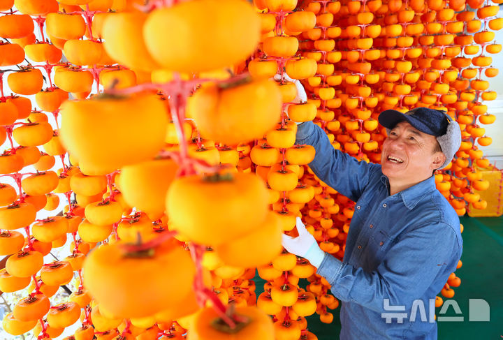 [함양=뉴시스]  절기상 입동(立冬)을 이틀 앞둔 5일 경남 함양군 서하면 봉전리 오현마을 신서성(48)씨가 곶감 건조대에 매달린 곶감을 정성스레 손질하고 있다. (사진=함양군 제공) 2025. 11. 05. [email protected]